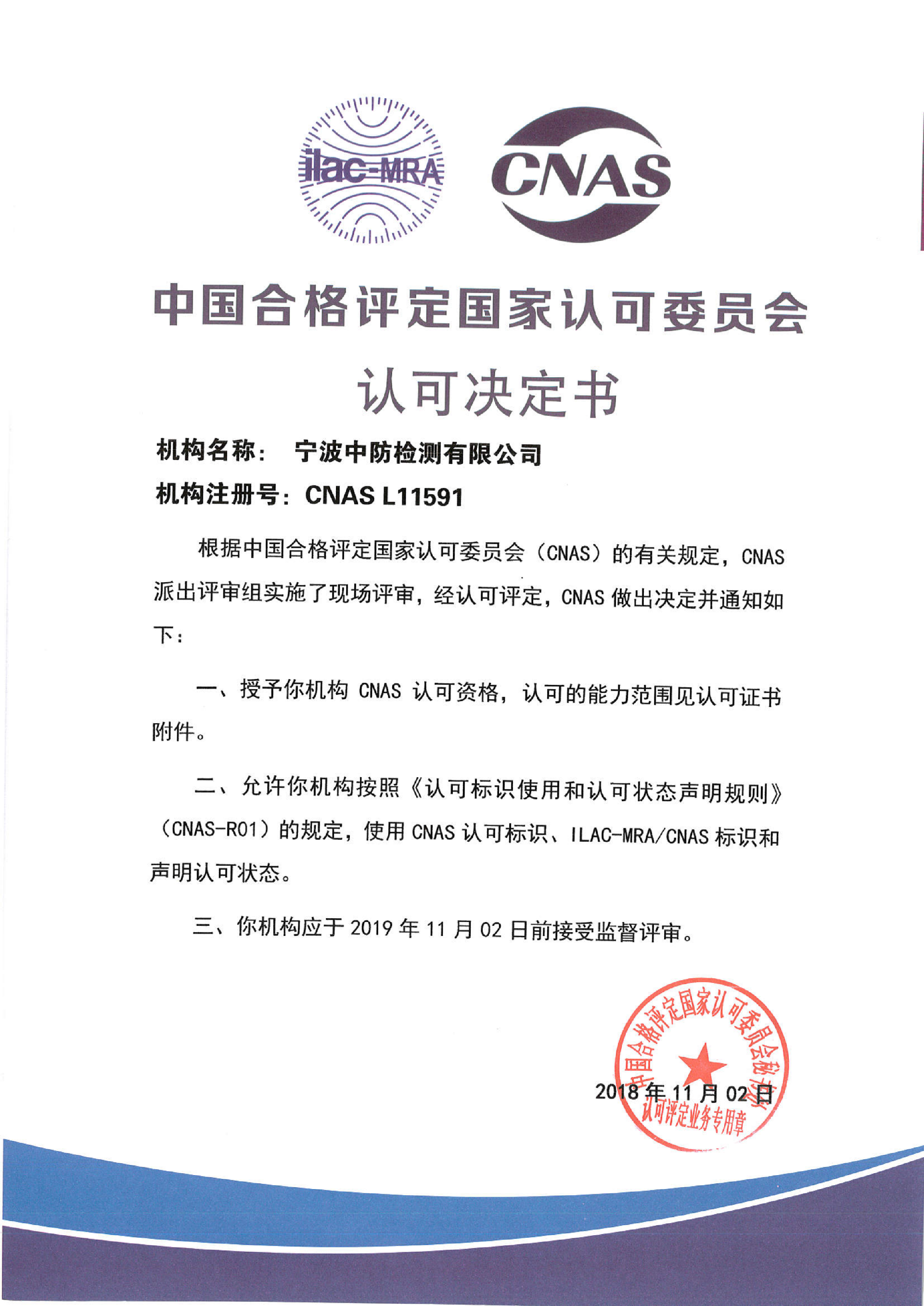 2018年9月1日,中國合格評定認可委員會(CNAS)評審專家組對鈺烯旗下的寧波中防檢測有限公司進行了審查,通過為期兩天的現(xiàn)場評審和資料核查,同意推薦寧波中防檢測有限公司通過CNAS認證。