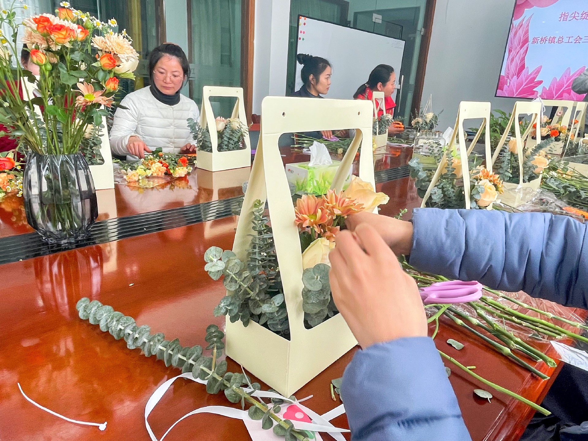 高貴優(yōu)雅的白玫瑰、含苞待放的康乃馨、清新脫俗的洋甘菊......一束束色彩斑斕的鮮花整齊有序地擺放在桌面上,在一片歡聲笑語中,大家充分發(fā)揮想象力和創(chuàng)造力,選花、去葉、剪接,再根據(jù)不同的色彩、形狀有層次地搭配在一起,經(jīng)過一修一剪一插,一籃籃別出心裁、錯落有致、造型迥異的花藝作品精彩呈現(xiàn),書寫出五彩繽紛的春天氣息,展現(xiàn)了各自心中姹紫嫣紅的錦簇花園。看著自己親手設(shè)計創(chuàng)意制作完成的花藝作品,每一位女職工臉上都洋溢著幸福燦爛的笑容。