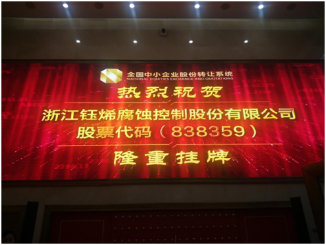 2016年10月27日,浙江鈺烯腐蝕控制股份有限公司新三板掛牌儀式在京隆重舉行,公司董事長(zhǎng)歐曙輝先生帶領(lǐng)公司主要成員與合作伙伴共同參與了此次慶典。儀式上,董事會(huì)秘書(shū)萬(wàn)勵(lì)先生作為公司代表進(jìn)行了發(fā)言,對(duì)新三板的市場(chǎng)建設(shè)建言,尤其是要充分利用這個(gè)良好平臺(tái),促使中小型企業(yè)穩(wěn)步、健康、持續(xù)發(fā)展,積極拓展投融資渠道,制定企業(yè)資本市場(chǎng)的長(zhǎng)期發(fā)展戰(zhàn)略,充分享受登錄資本市場(chǎng)、成為公眾公司的紅利。