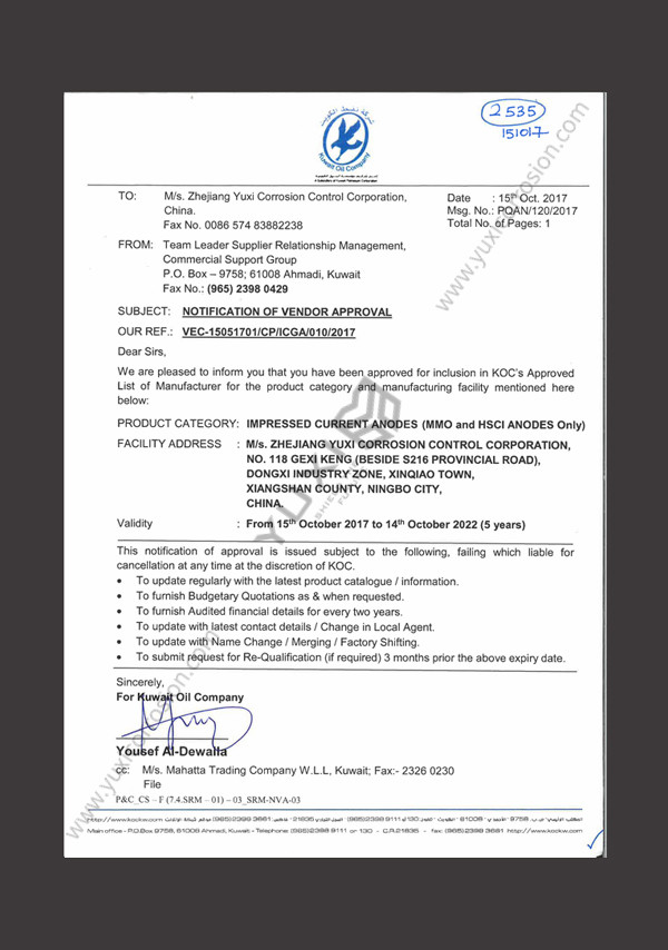 2017年10月15日,浙江鈺烯腐蝕控制股份有限公司順利通過科威特國家原油公司KOC認(rèn)證,成為陰極保護(hù)系列產(chǎn)品的供應(yīng)商。