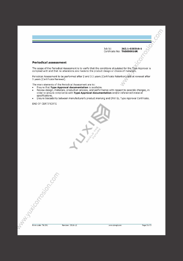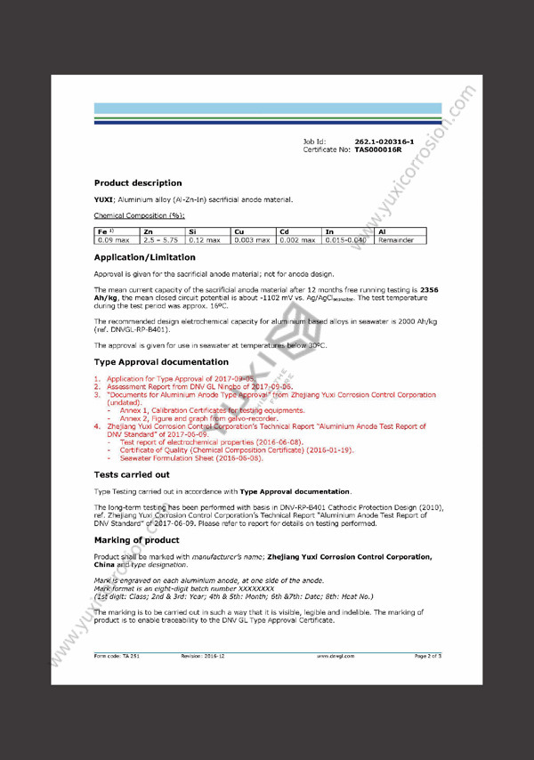 2017年9月6日,在經(jīng)過(guò)一年多的檢驗(yàn)和測(cè)試后浙江鈺烯腐蝕控制股份公司的鋁合金犧牲陽(yáng)極產(chǎn)品順利通過(guò)了挪威船級(jí)社(DNV GL)的認(rèn)證,并得到這家行業(yè)內(nèi)權(quán)威認(rèn)證機(jī)構(gòu)簽發(fā)的形式認(rèn)證證書,證書編號(hào)TAS000016R。