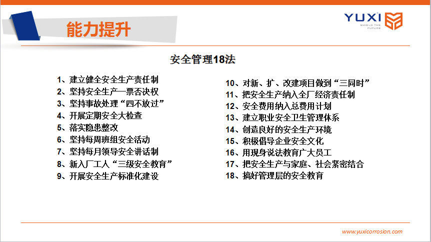 本次培訓(xùn)過(guò)程中,浙江鈺烯從安全生產(chǎn)領(lǐng)域的法律法規(guī)、安全生產(chǎn)意識(shí)提升、安全生產(chǎn)能力增強(qiáng)三個(gè)方面入手,對(duì)全廠員工進(jìn)行安全教育,并將遵照《安全管理十八法》,逐步完善本廠安全生產(chǎn)體系,做到五到位五落實(shí),為員工和工廠的安全負(fù)責(zé)。
