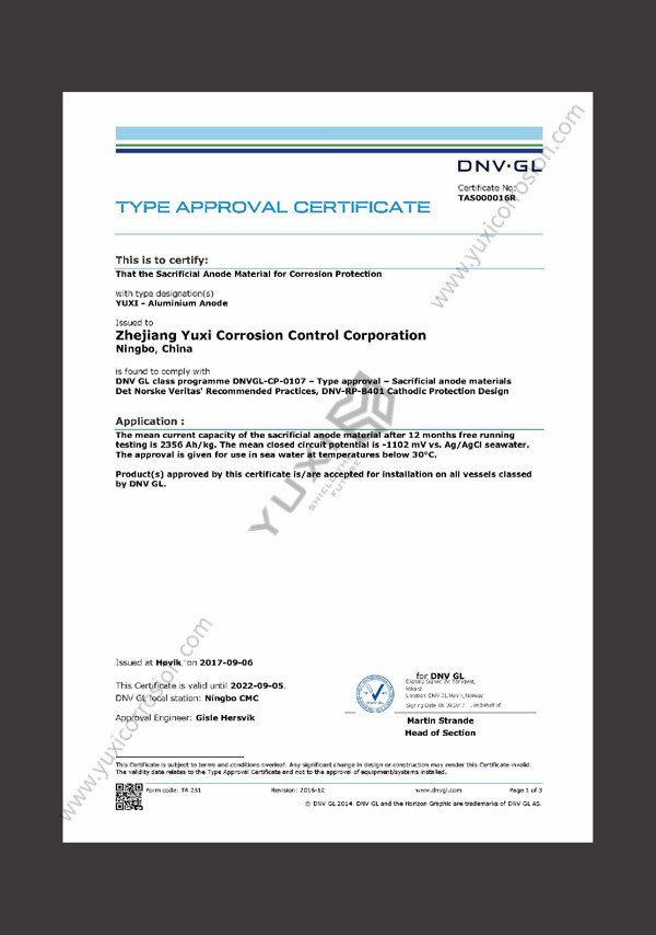 2017年9月6日,在經(jīng)過一年多的檢驗和測試后浙江鈺烯腐蝕控制股份公司的鋁合金犧牲陽極產(chǎn)品順利通過了挪威船級社(DNV GL)的認證,并得到這家行業(yè)內(nèi)權(quán)威認證機構(gòu)簽發(fā)的形式認證證書,證書編號TAS000016R。DNV·GL(挪威船級社·德國勞氏船級社)集團是世界上公認的在海運、石油天然氣、電力和···