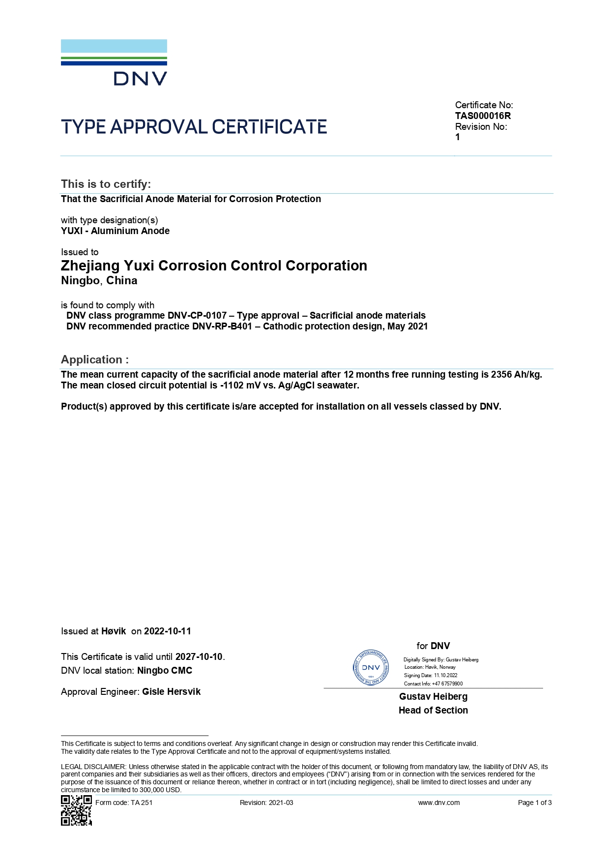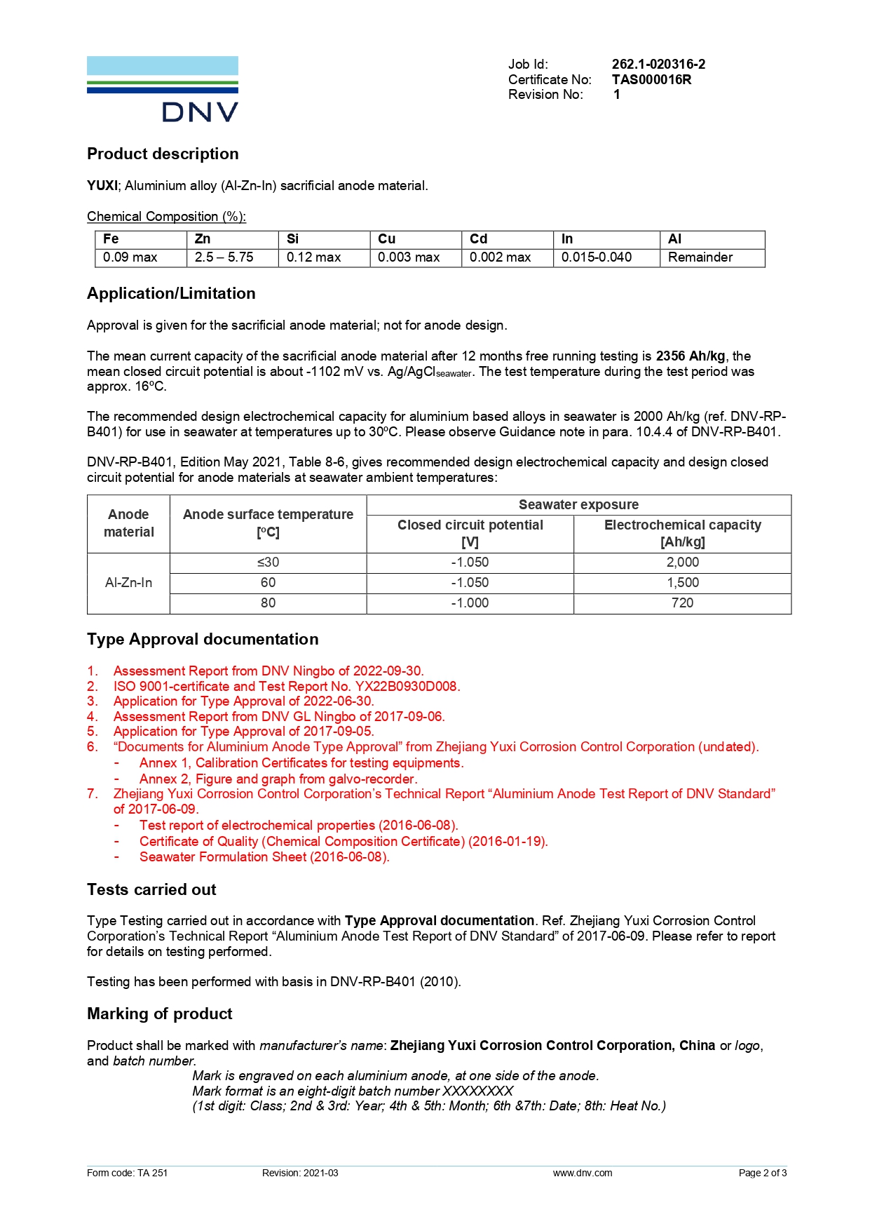 DNV鋁陽(yáng)極型式認(rèn)可證書(shū)