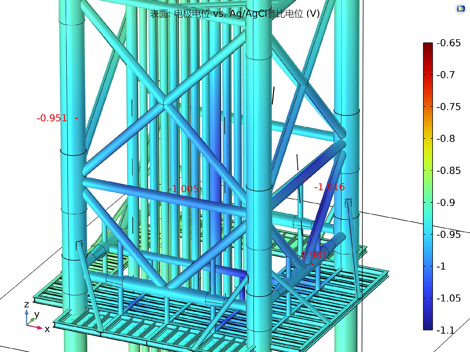 (1)模擬海上平臺(tái)、儲(chǔ)罐、船舶、特殊管段等被保護(hù)體的陰極保護(hù)系統(tǒng),計(jì)算陰極保護(hù)電位分布,優(yōu)化設(shè)計(jì)和技術(shù)改造;